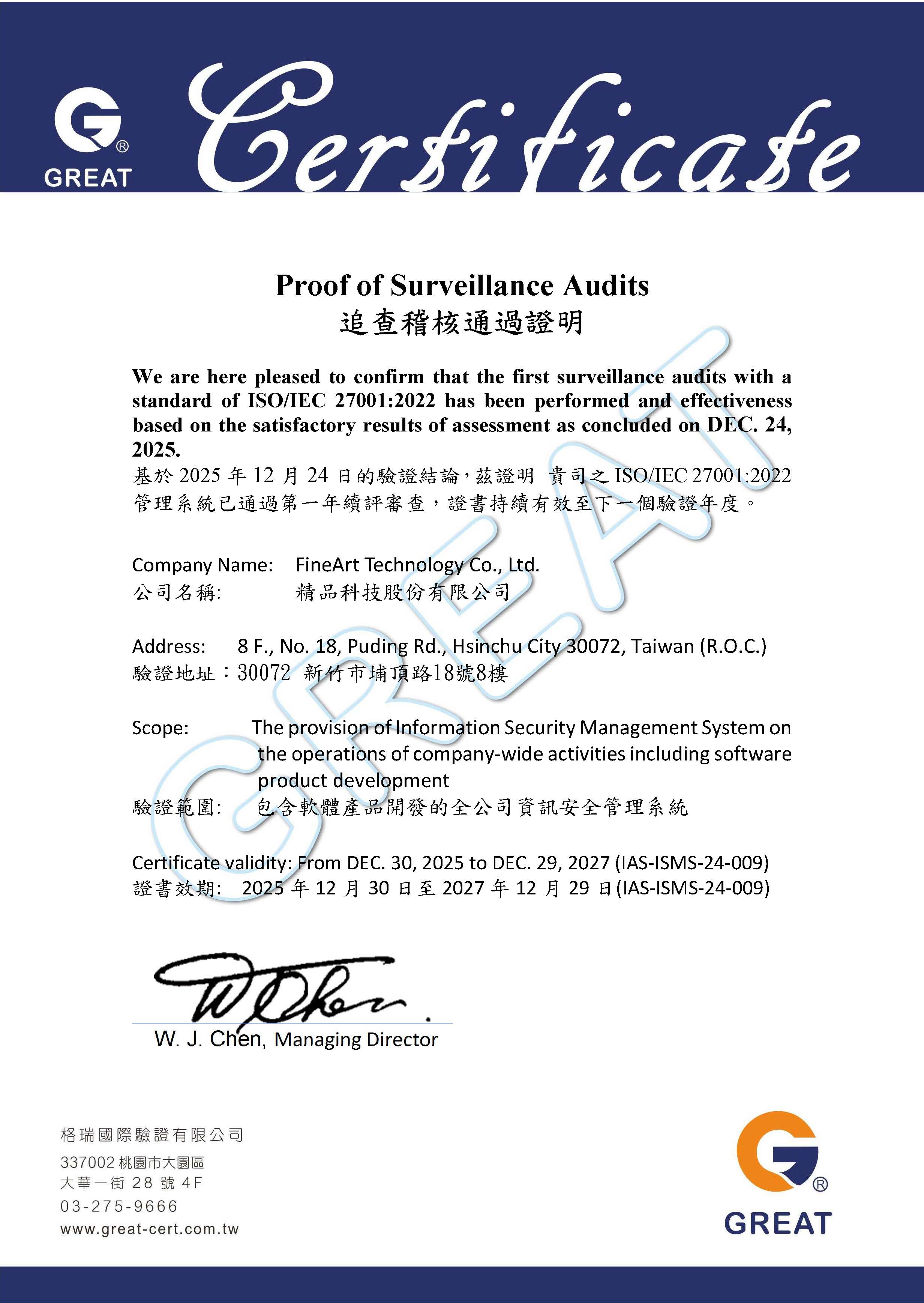 精品科技於 2025 年 12 月 24 日順利完成 ISO/IEC 27001:2022 資訊安全管理系統第一次追查稽核(Proof of Surveillance Audits),並獲得國際驗證機構格瑞國際核發「追查稽核通過證明」。此次稽核結果顯示,精品科技在資訊安全管理制度的執行與有效性均達到國際標準要求,確保企業營運及產品研發過程中的資訊安全,降低風險及保障客戶資料安全方面的承諾。