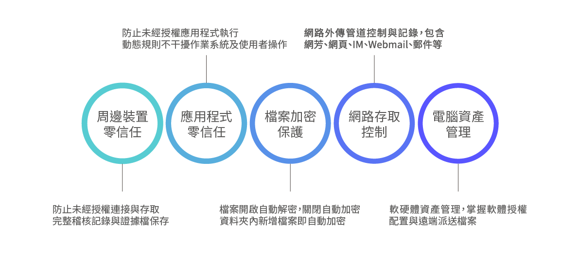 - 全盤掌握周邊裝置:周邊裝置零信任,有效控管電腦周邊裝置,避免資料外流